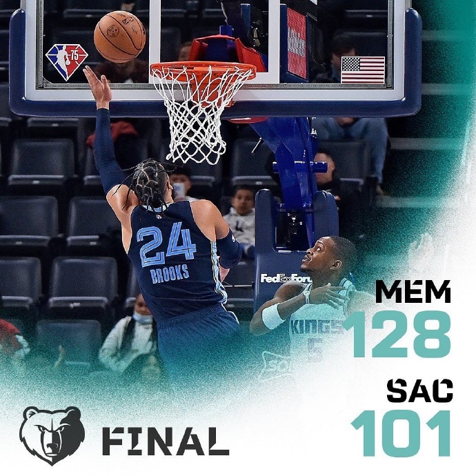 灰熊(10-10):布鲁克斯21分6篮板2抢断、小贾伦-杰克逊17分9篮板2盖帽、贝恩18分5篮板2助攻、梅尔顿14分5篮板4助攻、康查尔9分9篮板2助攻、扎伊尔-威廉姆斯8分、安德森7分5篮板4助攻、泰厄斯-琼斯6分8助攻、蒂利5分、亚当斯3分12篮板4助攻3盖帽、阿尔达玛3分、蒂尔曼2分