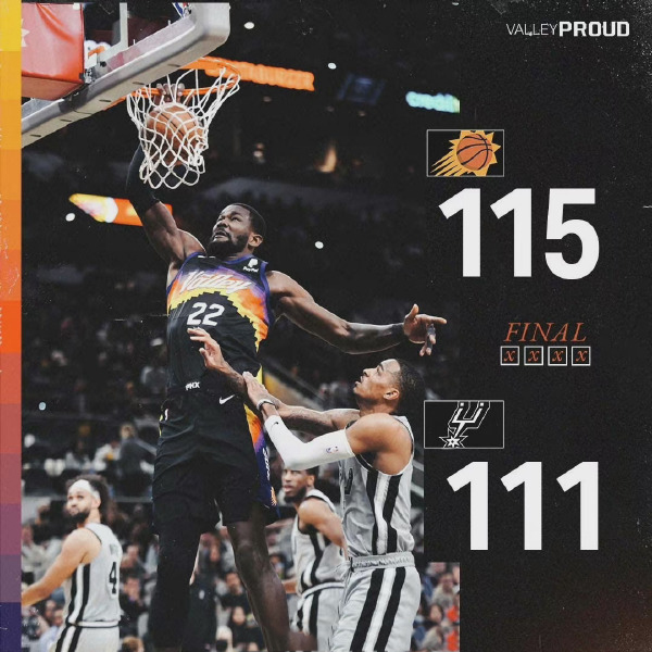 太阳(14-3):布克23分3篮板4助攻,佩恩20分3篮板3助攻,麦基14分8篮板,沙梅特11分2篮板5助攻,保罗12分4助攻,克劳德6分2抢断,布里奇斯5分6篮板2抢断。