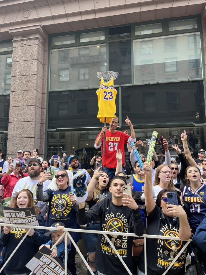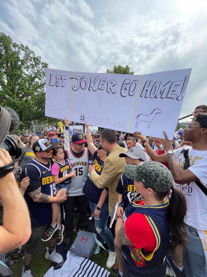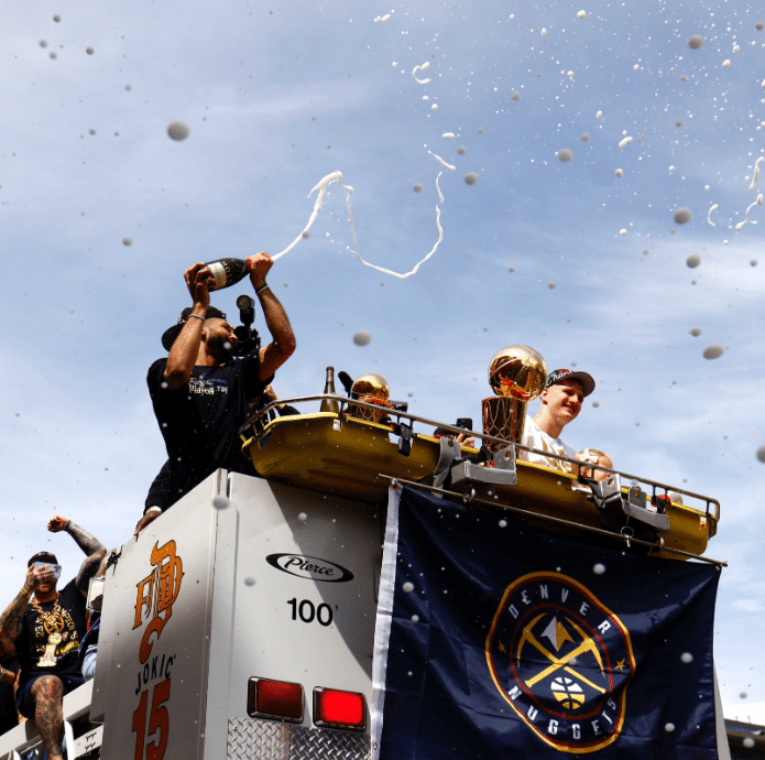 发表演讲时,约基奇这样说道:你们都知道我说过,我不想参加冠军游行,我想要回家。但现在我TMD就想留在游行之中,这就是最棒的,这种感觉太美妙了,这是我们一生中都会铭记的时刻,看到你们在街上欢呼我很开心,我爱你们,丹佛,这个冠军是为你赢下的(Denver. This one is for you)。