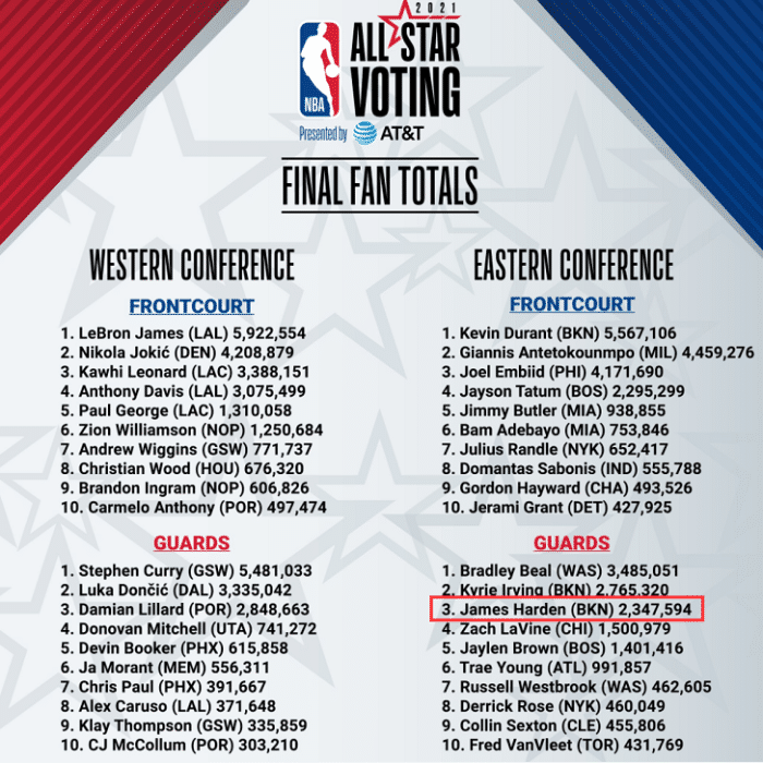 哈登太尴尬了!首次东游却落选全明星首发,票数不足詹皇KD一半