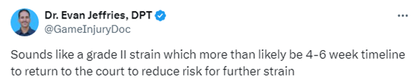 墨菲不幸拉伤腿筋,医学专家Evan Jeffries表示,听起来像是二级拉伤,很可能需要4-6周的时间才能重返球场,以降低进一步拉伤的风险。