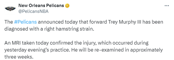 鹈鹕官宣,球队前锋特雷-墨菲三世的伤情被诊断为右腿筋拉伤,他是在昨天的训练中受伤的,今天做出了核磁共振检查,他将在三周后重新接受复查。