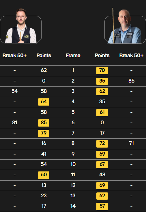 下半场开始,特鲁姆普还不如之前,马克.威廉姆斯以69-41、67-54连胜两局,第11局特鲁姆普以60-48拿下这局,第12局马克.威廉姆斯以69-13赢得缠斗,第13局马克.威廉姆斯以62-23完成超分,率先拿到赛点,第14局马克.威廉姆斯57-17锁定胜利,最终10-4战胜特鲁姆普。
