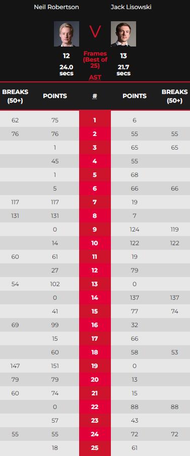 不过接下来,尼尔-罗伯逊突然爆发,打出1杆147和2杆60+,以60-58(53)、151(147)-0、79(79)-13和74(60)-15连胜4局,大比分11-10反超。第22局,利索夫斯基打出单杆88分,以88(88)-0将大比分追成11平。第23局,“澳洲火炮”通过多次上手,以57-43胜出,大比分12-11率先拿到赛点。