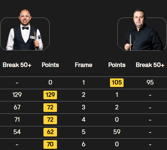 北京时间2024年3月21日,斯诺克世界公开赛第四比赛日,1/8决赛中,巴里-霍金斯对阵马奎尔,最终,巴里-霍金斯出色发挥凭借单杆打出129分、67分、71分和54分,总比分5-1击败对手马奎尔,顺利晋级八强!