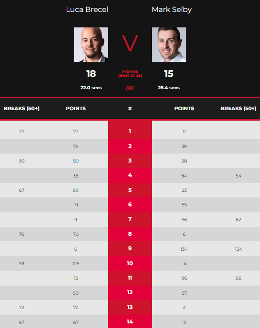 第四阶段,布雷切尔第26局一杆67分胜出后,塞尔比一路狂追,连拿五局追至16-15。第32局布雷切尔单杆攻下51分获胜,17-15获得赛点。第33局,布雷切尔以一杆112分的破百零封,最终总比分18-15赢下比赛。