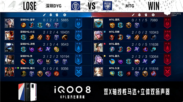 双方常规开局,1分29秒深圳DYG野区团战打出1换3。21分22秒MTG对抗路击杀夏侯惇。4分04秒野区团战MTG打出1换3。5分01秒MTG摧毁敌方中路外塔。5分57秒MTG野区击杀不知火舞。8分07秒MTG拿下暴君。10分29秒MTG拿下暗影主宰。10分54秒MTG拿下暗影暴君。11分42秒MTG摧毁敌方中路高地塔。12分33秒MTG摧毁敌方发育路高地塔。13分42秒MTG摧毁敌方水晶拿下比赛。