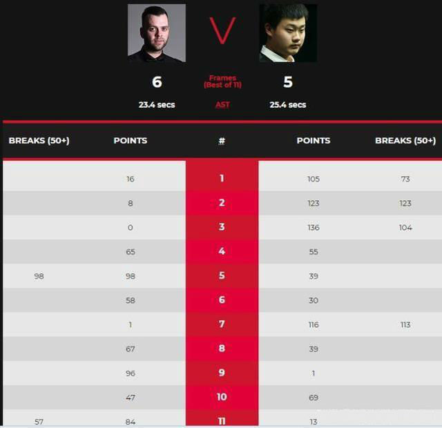 本场比赛,赵剑波有一个极其完美的开局,他在前三局轰出123分、104分、73分,3-0强势开局。第4局,开局连丢三局之后,吉米开始了反击。他以65-55扳回一局,比分追成3-1。