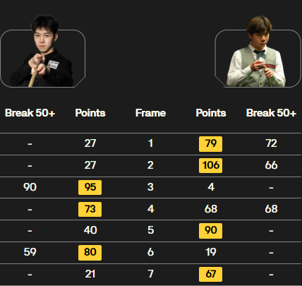 开局领先:比赛开始后,雷佩凡迅速进入状态,首局凭借单杆72分的出色表现以79:27先胜一局,取得1-0的领先。随后,他又在第二局打出单杆66分,并以106:27再胜一局,将比分扩大为2-0。