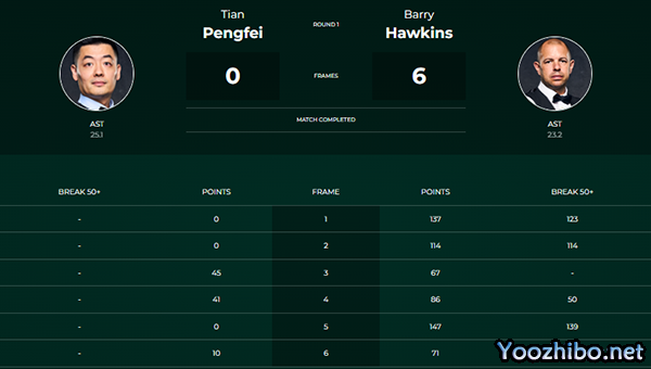 北京时间11月5日,2023斯诺克国际锦标赛第1轮中,田鹏飞对阵巴里-霍金斯,巴里-霍金斯手感火热,凭借单杆打出两杆50+和三杆破百,大比分6-0轻取田鹏飞,顺利晋级下轮。