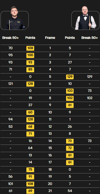 第一阶段凯伦-威尔逊5-3希金斯,凯伦-威尔逊打出单杆95分、93分、71分、70分连赢四局,第五局希金斯轰出单杆129分,第六局凯伦-威尔逊轰出单杆121分,随后希金斯轰出单杆102分、73分,每局至少是单杆70+,说明两人竞技状态都还不错。