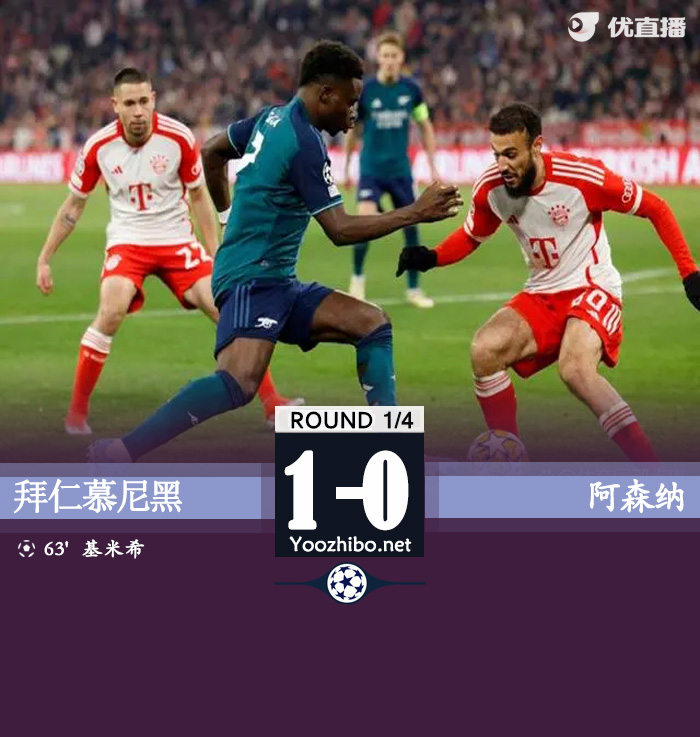 24直播网讯:北京时间4月18日欧洲冠军联赛 1/4决赛次回合,拜仁慕尼黑主场对阵阿森纳。凯恩开场连续打门造险,穆西亚拉远射被扑,马丁内利推射被诺伊尔没收,下半场格雷茨卡和格雷罗先后中柱,基米希头球冲顶破门。最终比分拜仁 1-0 阿森纳。两回合总比分拜仁3-2阿森纳。